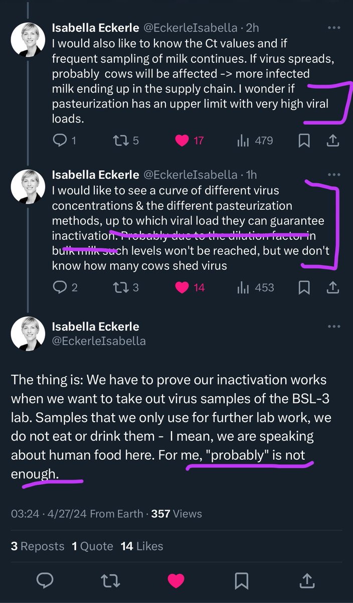 UPDATE—Very preliminary partial results from FDA tests show PCR positive pasteurized milk so far are not active virus—though more testing of 297 positive retail milk🥛 samples are needed and still pending. ➡️HOWEVER, we expected most to be negative, but DOSE OF VIRUS LOAD MATTERS. Esteemed virologist @EckerleIsabella says we don’t know many things still: