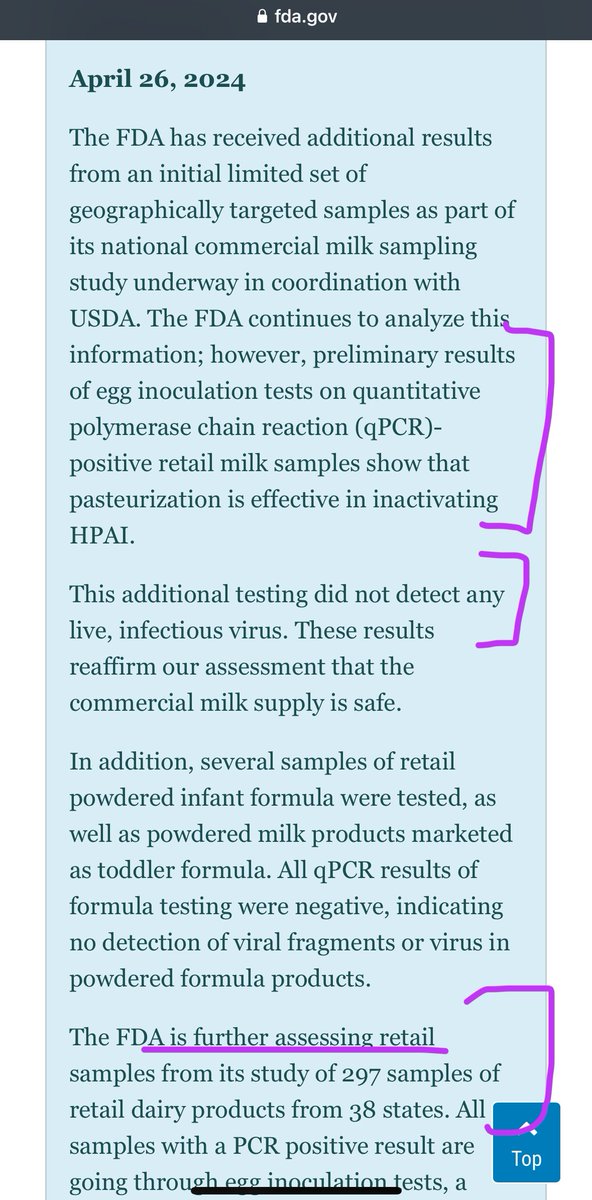 The FDA said it has been trying to see if it could grow virus from milk found to contain evidence of H5N1, which is the gold standard test to see if there is viable virus in a product. 📌The FDA *does NOT explicitly say FDA laboratories were unable to find live virus in the milk samples, but nevertheless it does state that its belief that commercial, pasteurized milk is safe to consume has not been altered by these findings.