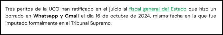 MAC publicó a las 23:51 en la SER el correo con “ciertamente se han cometido 2 delitos”. Afirmó en juicio que su fuente le dejó verlo y lo copió sobre las 15:34 del 13/3 (antes de que lo tuviera el FGE), pero no le dejó desvelarlo hasta las 23:25.