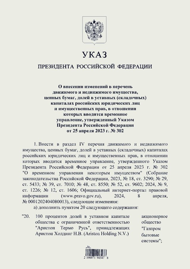 2/ Le filiali russe dell’italiana Ariston e della tedesca Bosch sono state temporaneamente trasferite alla Gazprom Domestic Systems, del gruppo Gazprom, come per decreto firmato quest’oggi dal Presidente Vladimir Putin. publication.pravo.gov.ru/document/00012…