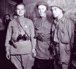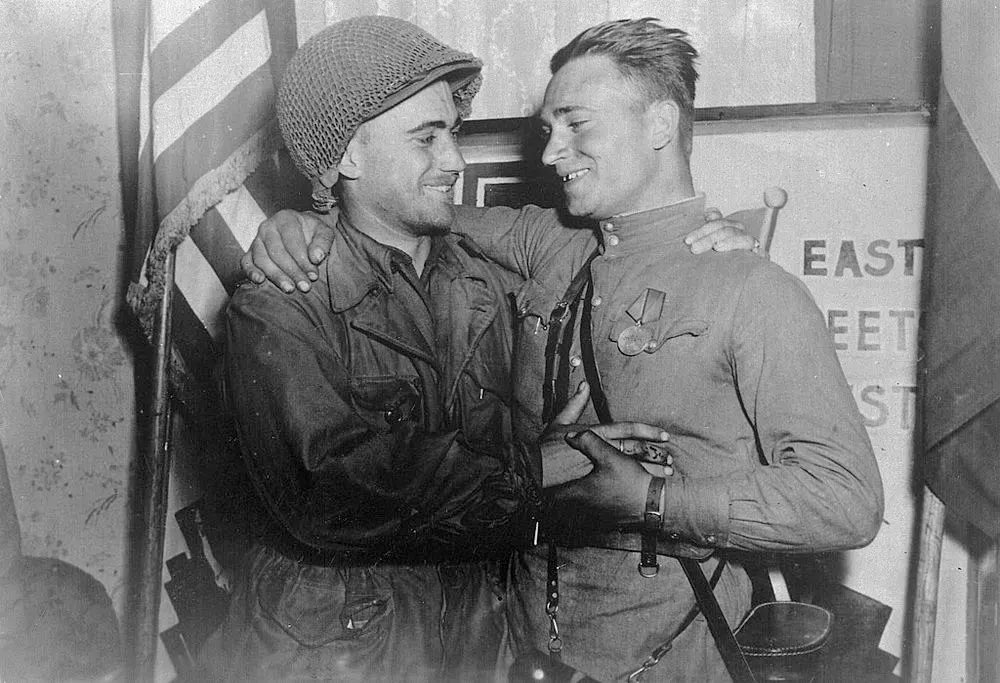 🧵 Il soldato a sinistra è Alexander Silvashko, ufficiale della 58ª Divisione Fucilieri della Guardia dell’Armata Rossa. A destra c'è William Robertson, sottotenente del 273° reggimento della 69ª Divisione di fanteria americana.
