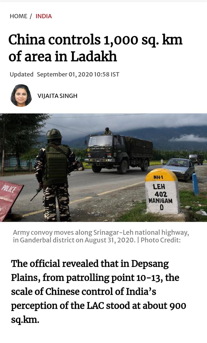 "About 1000 square kilometres of area in Ladakh along the Line of Actual Control (LAC) is now under Chinese control, intelligence inputs provided to the Centre suggest."