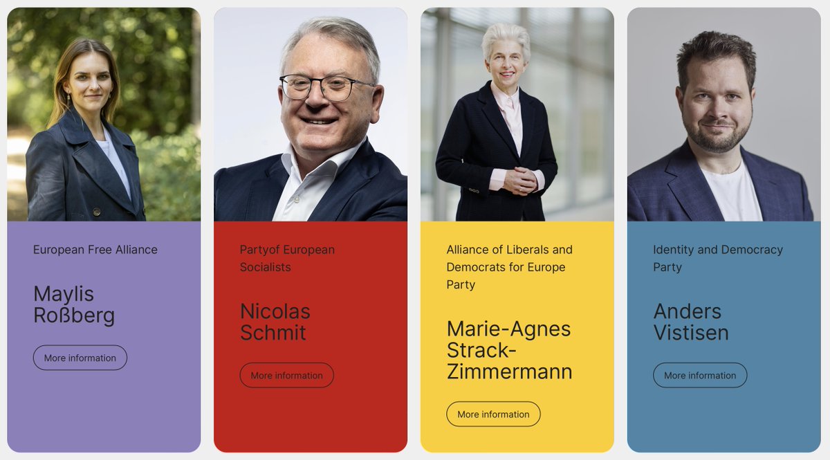 Naast Von der Leyen [christendemocraten, CDA e.a.] zou je Schmit [sociaaldemocraten, PvdA e.a.] relevant kunnen noemen, een soort van kanshebber, als men tenminste dit Spitzenkandidatensysteem volgt. Twijfelgeval: mevrouw Zimmerman van de liberalen [VVD e.a.]. Eigenlijk kansloos.