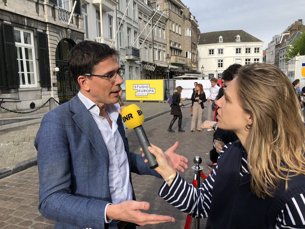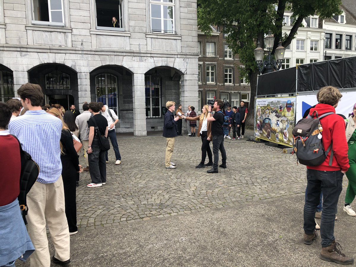 Eddy Wax van Politico staat op het Vrijthof en hij doet alsof het een drukte van jewelste op het Plein is. Dat is niet zo, dat hebben we net heel goed gezien. Drie studenten mogen bij Eddy vertellen wat ze willen stemmen. Een van hen wil Volt stemmen.