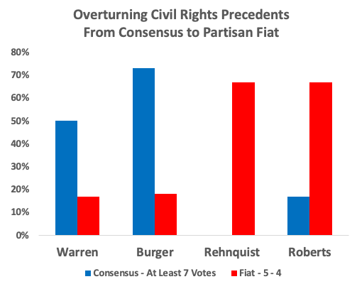 Federalist Society justices have abandoned previous norms of seeking consensus before overturning major precedents, especially when it comes to civil rights.