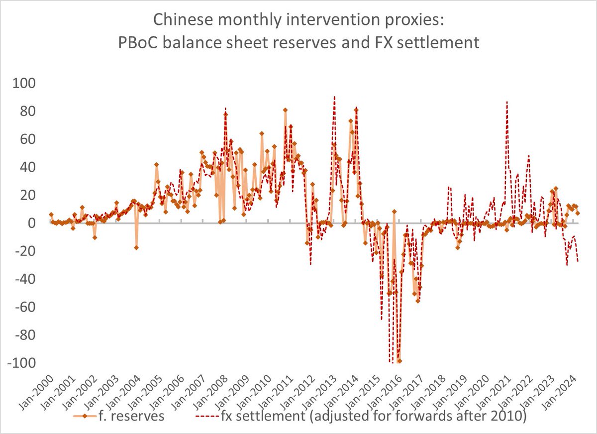 The settlement v PBOC balance sheet gap (which should correspond in theory to fx sales from the state banks) is also large in the trailing 12m (captures activity over the last year)
