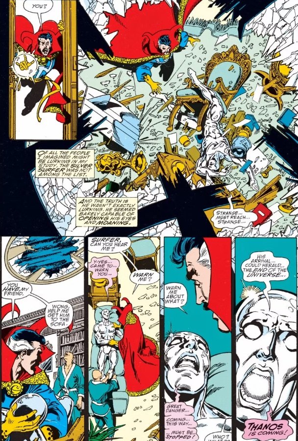 Early on, Hulk (Mark Ruffalo) crashes through the roof of Doctor Strange's Sanctum Sanctorum. This is taken from The Infinity Gauntlet, which begins in a similar fashion. In the comic, the Silver Surfer crashes through Strange’s window to say Thanos is coming.