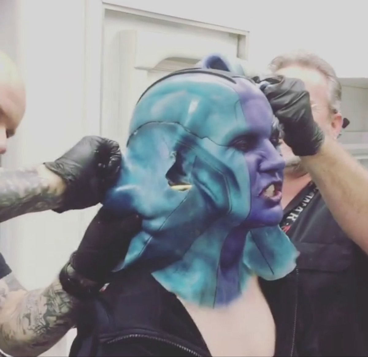 A challenge for Legacy was working with Karen Gillan as Nebula, who has no hair. On Guardians of the Galaxy Vol. 2, Gillan had shaved her head, but this time had to keep her thick red hair. As such, Legacy had to devise a new way of creating a bald cap.