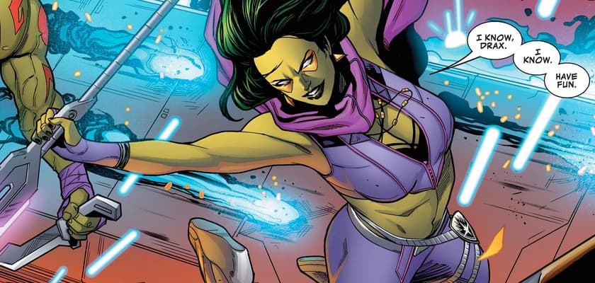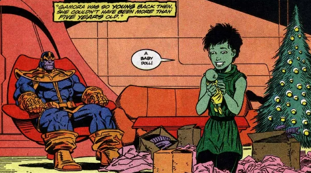 In a flashback sequence, we see that Gamora was adopted as a child by Thanos after a genocide he committed on her home planet. In the original comics, Gamora was created by Thanos using genetic engineering.