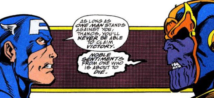 The man left standing between Thanos and the final Stone is Captain America, who uses his last ounce of strength to try and stop him. This is a nod to The Infinity Gauntlet, where Cap says "As long as one man stands against you, Thanos, you'll never claim victory.”