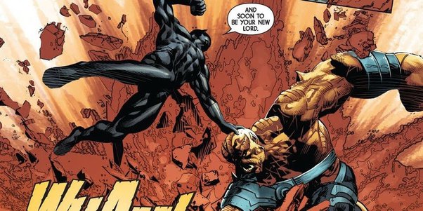Black Panther punches Black Order member Cull Obsidian during the battle. This is a famous image taken directly from the comic books.