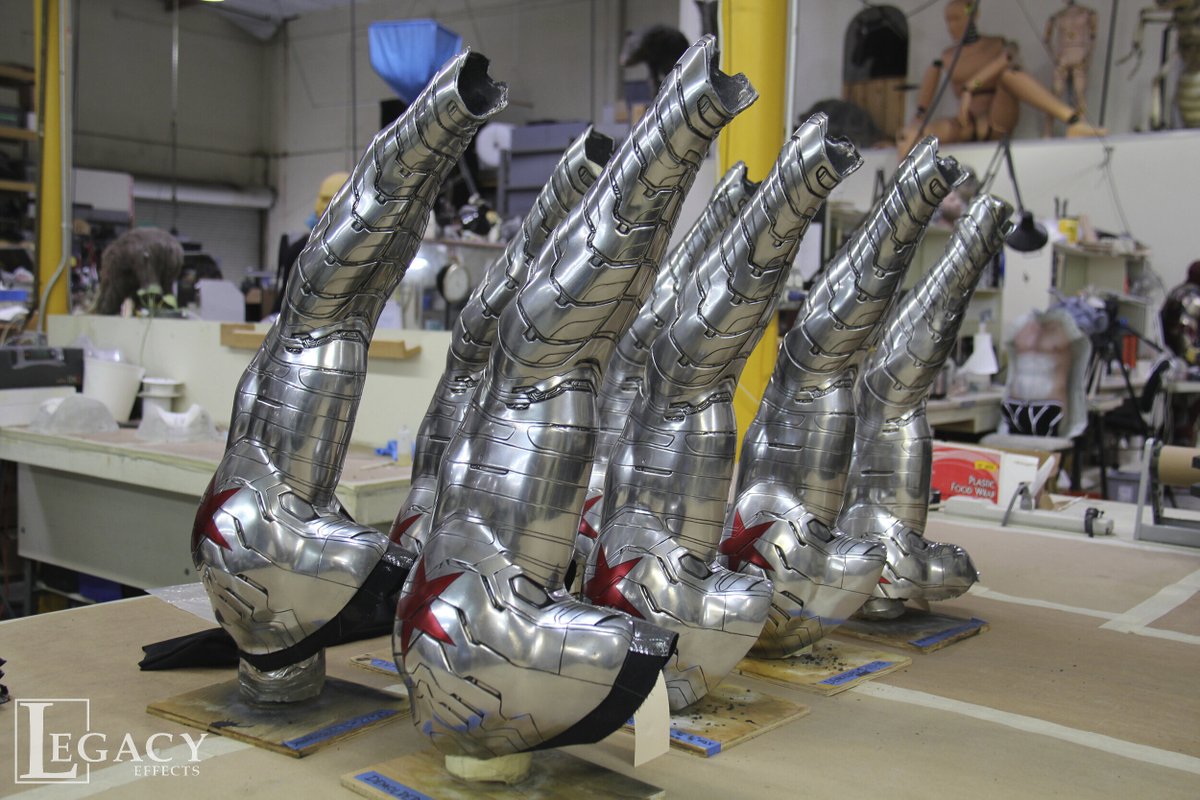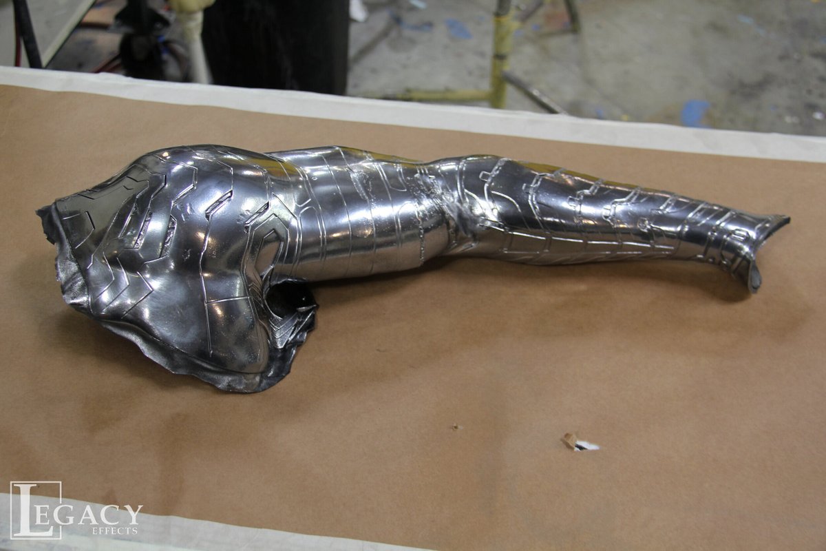 Lindsay MacGowan of Legacy said one of the most challenging of their pieces was creating Bucky Barnes’ (Sebastian Stan) metallic arm. Stan’s arm was cast in a flexible urethan and then painted with mirror-like flexible paint. Something similar was done for Nebula’s skin.