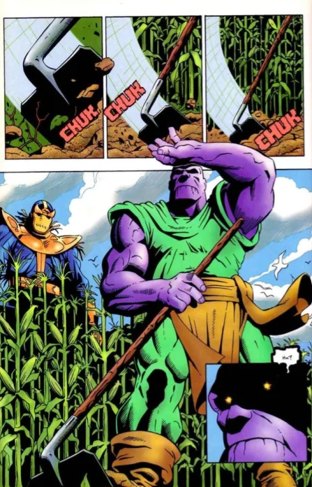 The denouement shows Thanos in exile, having achieved what he set out to. It was shot in the Banaue Rice Terraces in the Philippines, with Brolin edited in via CGI. In the comics, after his defeat, Thanos becomes a farmer, which inspired the finale here.
