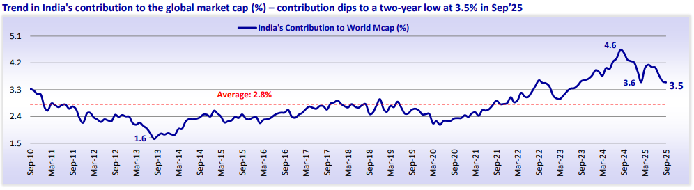 🔹 India’s global market cap share fell to 3.5%, a two-year low.