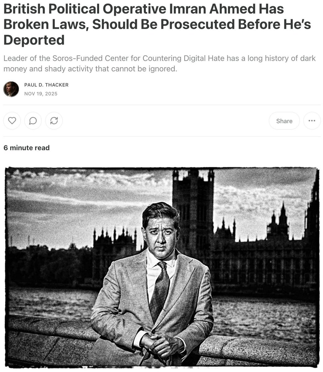 1) Imran Ahmed has broken US laws and resides in NE DC, yet Justice Department has not investigated him. Center for Countering Digital Hate has lied to Congress, lied to the IRS and is funded by Soros and dark money.