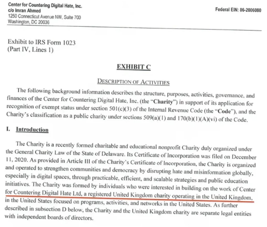 3) When applying for tax exempt status with the IRS, CCDH claimed they were already operating as a nonprofit in the UK. That statement to the IRS is false.