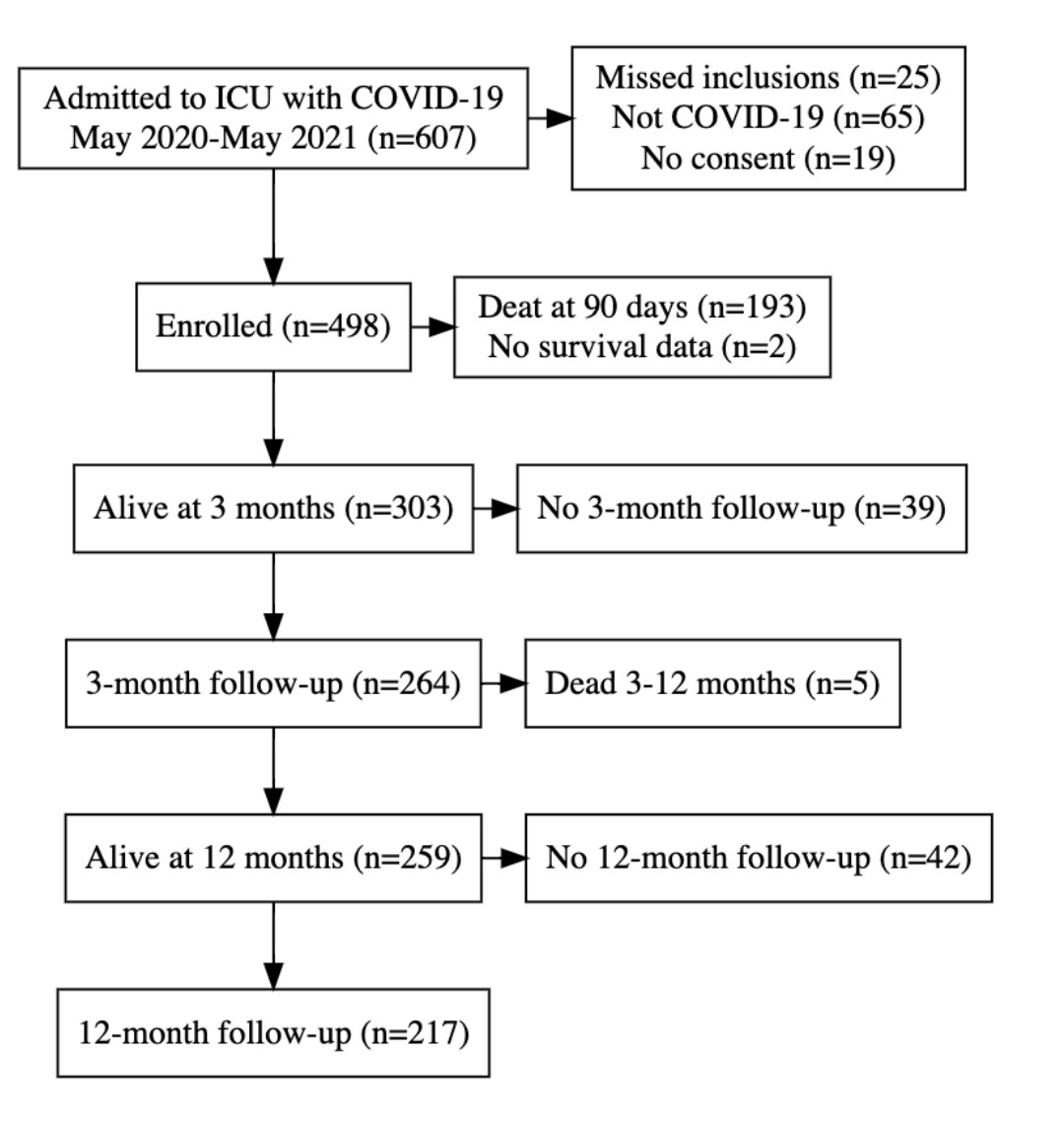 2) This was a prospective multicenter cohort study that examined long-term outcomes up to 12 months in 303 survivors of critical COVID-19 illness who were treated in ICUs in Sweden between May 2020-May 2021.