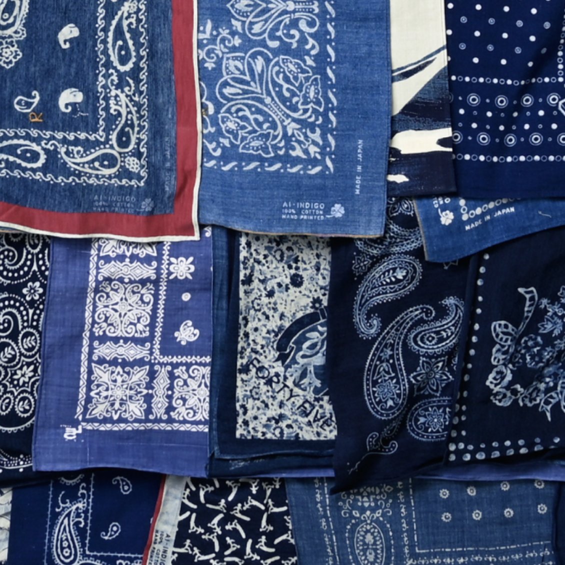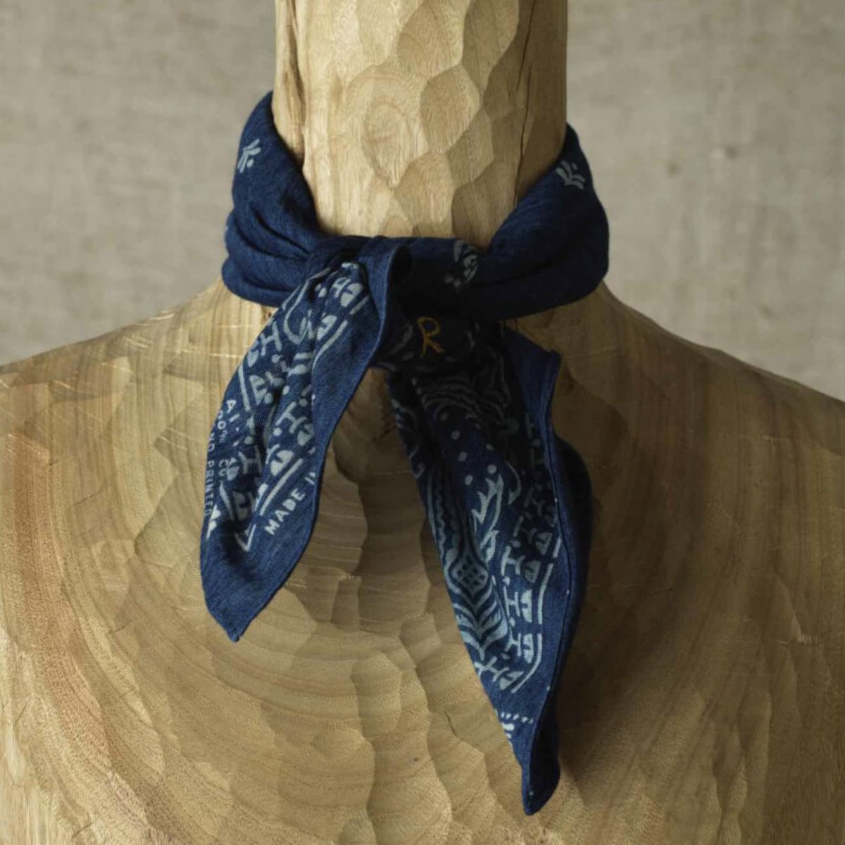 Even the bandanas involve a lot of craft. They're woven on old 110 cm looms, which is why these 55 cm bandanas have a selvedge on one side. Designs are hand drawn and then applied using a combination of hand silkscreening and discharge printing.
