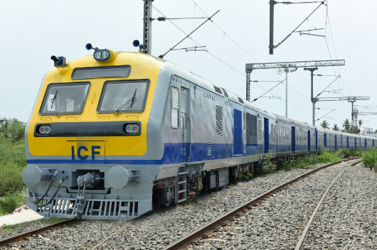 Diesel Electric Multiple Unit (DEMU) trains have integrated engines except that they are diesel-based. It was introduced to replace the slower loco-hauled passenger trains in non-electrified rail sections.