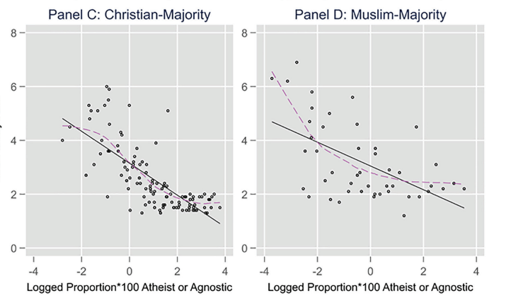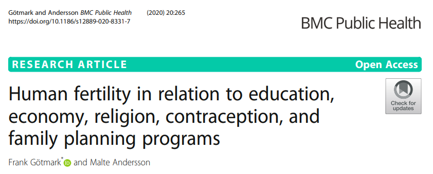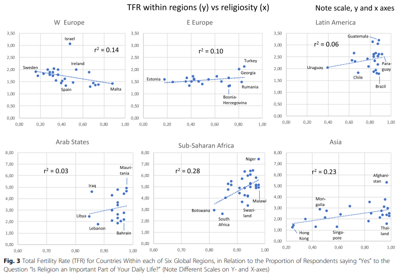 Götmark et al. (2020) found that fertility on the national and regional levels was positively correlated with the share of the population in a country that said, "Religion is an important part of daily life."