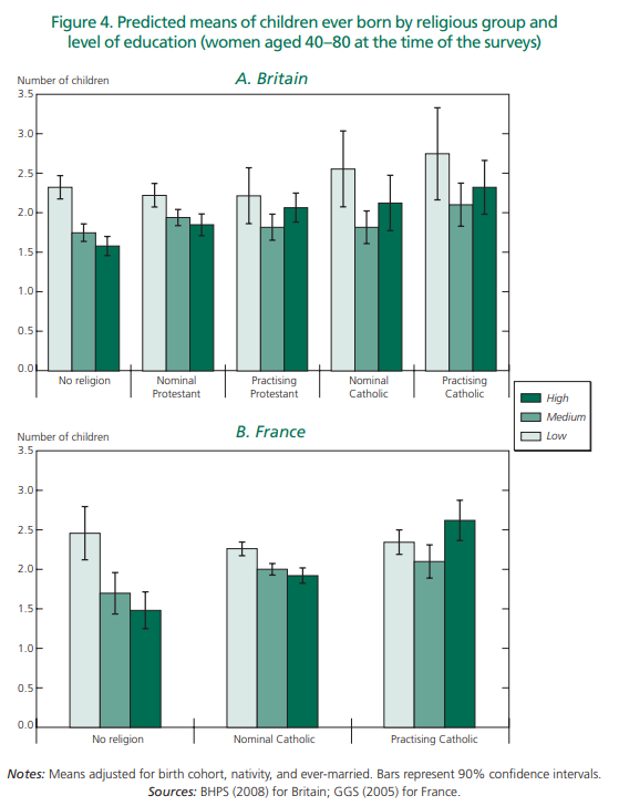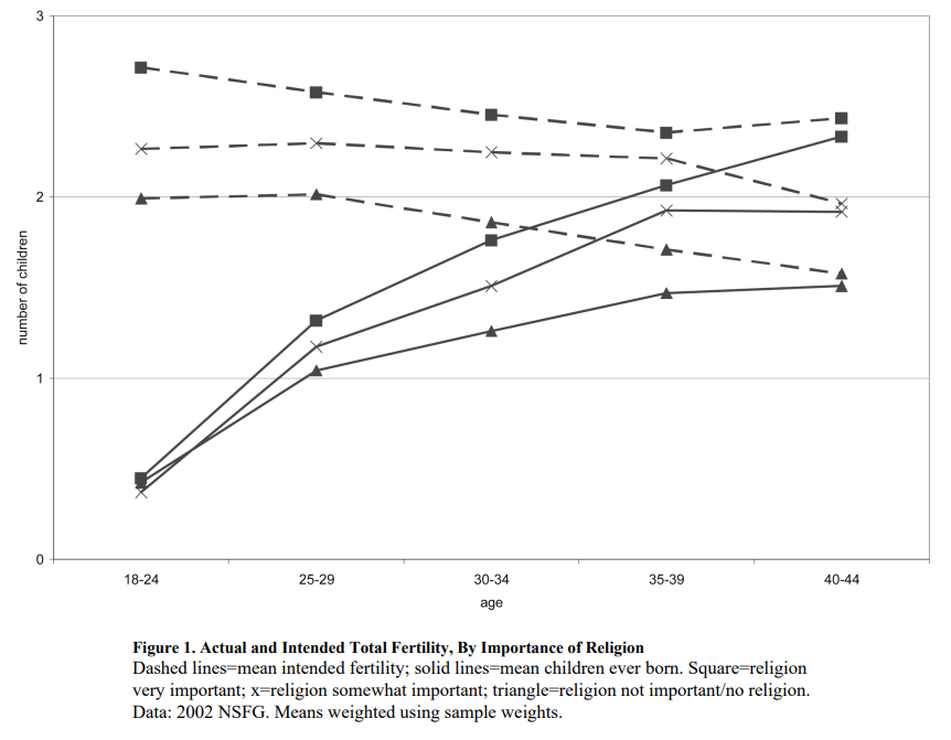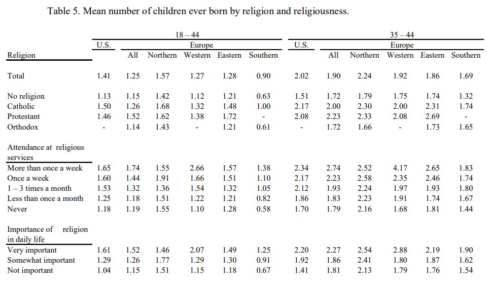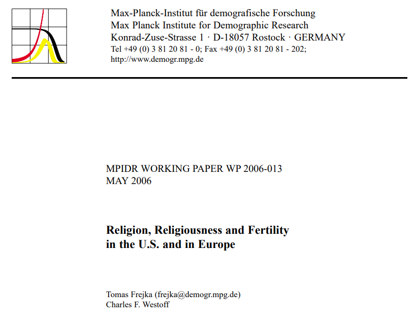 Frejka et al. (2006) found much higher fertility among the religious, with big differences according to religious attendance and ratings of religious importance in both the US and Europe.