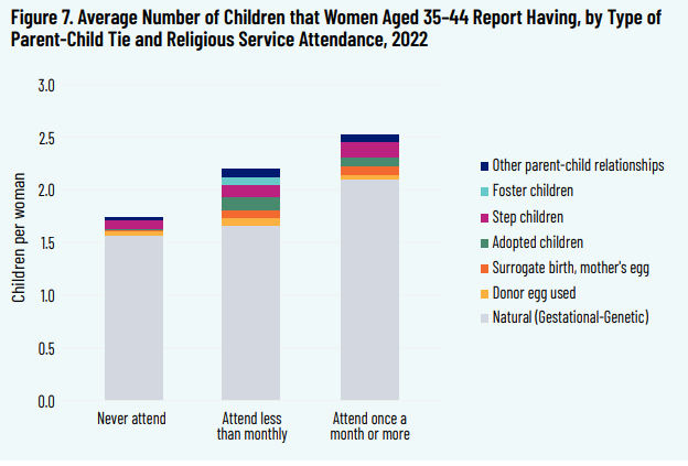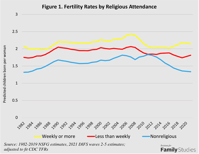 Stone (2022) found that fertility rates have been high and stable among religious attenders, and that declining fertility is due to a sharply increasing share of people that are not religious. 10/12