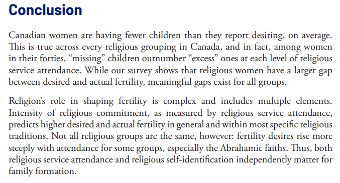 Stone (2023) found major differences in both intended and actual fertility among Canadian women based on religious attendance. Those who attended at least monthly had 0.8 more children than those who never attended. Interestingly, the religious used surrogacy more! (N=2700) 7/12