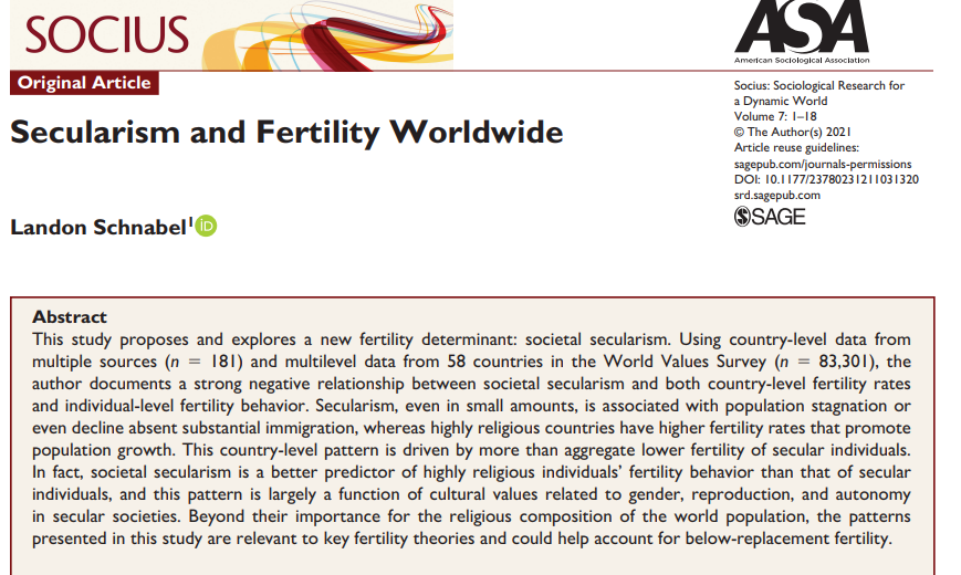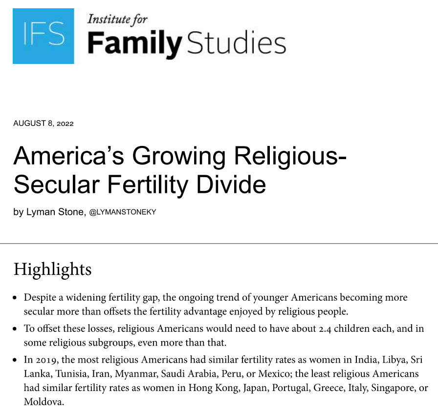 A review of the literature shows religious attendance & commitment are linked to much higher fertility, and declining religiosity is driving birthrates lower.