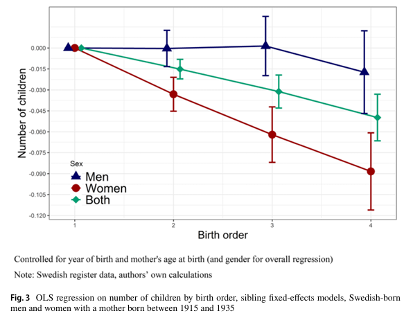 For women, the effect of a pay raise was significantly reduced future fertility. A pay increase at 25 was associated with a large decrease in fertility at age 30, regardless of the skill level.