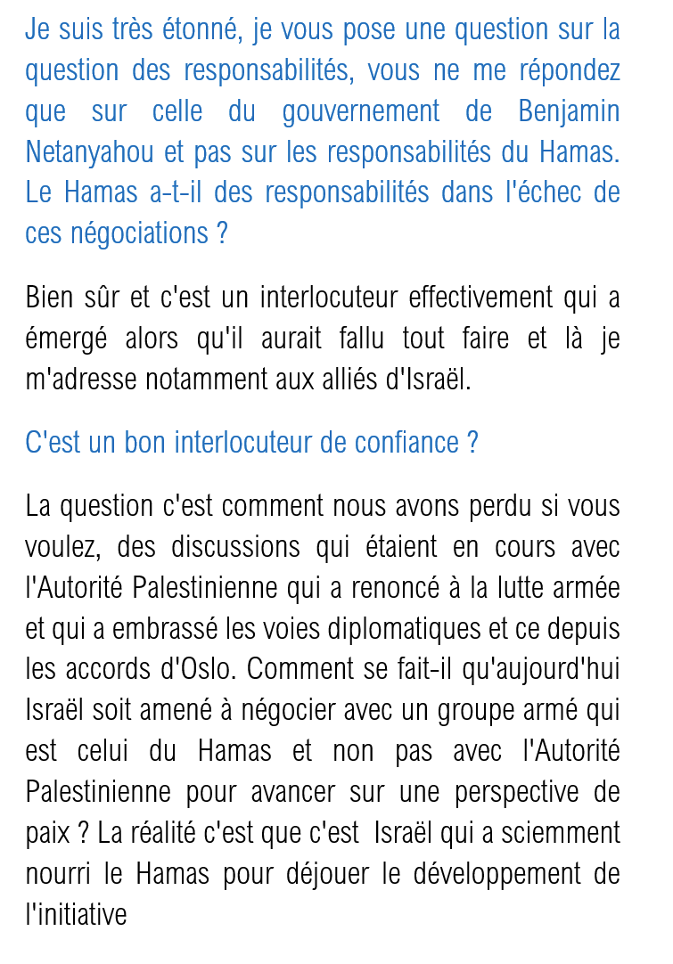 Et encore, toujours avec cette réserve qu'"Israël a sciemment nourri le Hamas" et sans répondre à la question de savoir si c'est un interlocuteur de confiance