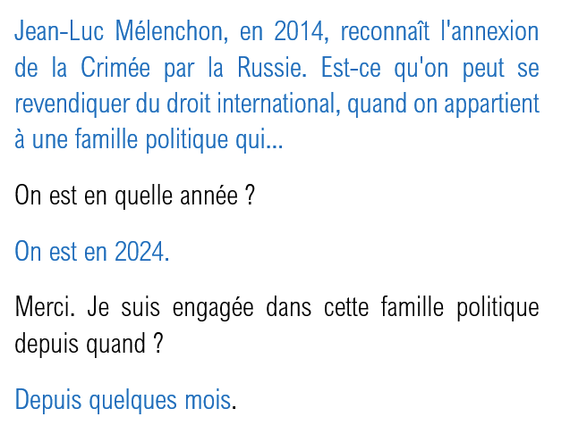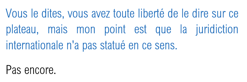 C'est délicat, s'aligner sur les positions de JLM ne ferait pas très "je parle la langue du droit international". Alors elle tente l'esquive. Je suis trop jeune, j'étais pas là en 2014