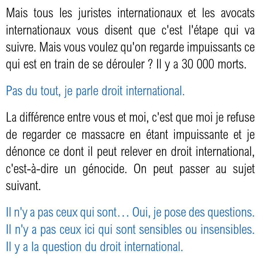 Après l'entrée, le plat : B. Duhamel l'interroge sur l'utilisation hasardeuse qu'elle fait du mot génocide alors que la Président de la CIJ en poste alors a spécifiquement indiqué qu'on ne pouvait pas lire dans son ordonnance ne serait-ce qu'un "risque génocidaire".