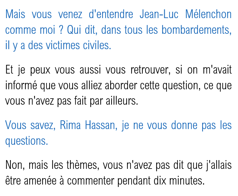 Au final cette parade réussit plutôt : on ne saura pas si les propos de JLM la choquent et surtout comment justifier le deux poids deux mesures avec la situation en Israël et les cris d'orfraie ("génocide, génocide") pour ce qui est une guerre. Oui, JLM 2015 avait raison, une guerre c'est sale, ça tue des civils. Elle ne le reconnaîtra pas.