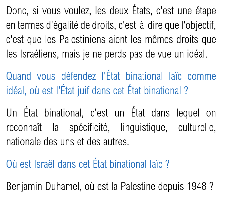 Quand B. Duhamel fait remarquer que ça signifie la disparition d'Israël, la réponse est sans ambiguïté: "où est la Palestine depuis 1948 ?". On comprend que c'est l'état dans lequel elle veut qu'Israël se retrouve.