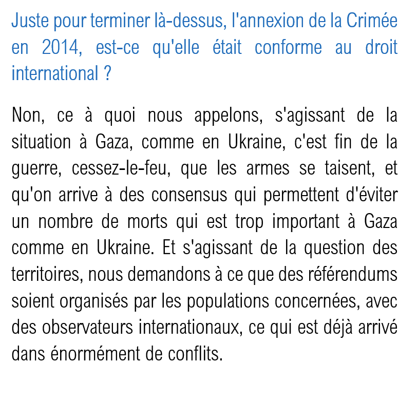 Et au passage magnifique démonstration de l'hypocrisie de sa posture sur Gaza, les question de B. Duhamel faisant apparaître un deux poids deux mesures de toute beauté