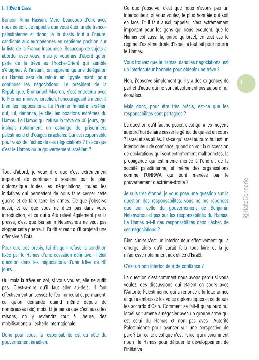 Pour Rima Hassan, c'est 💯% Israël. Il faut vraiment qu'elle soit poussée dans ses retranchements par un B. Duhamel qui s'en étonne pour attribuer une part de responsabilité au Hamas.