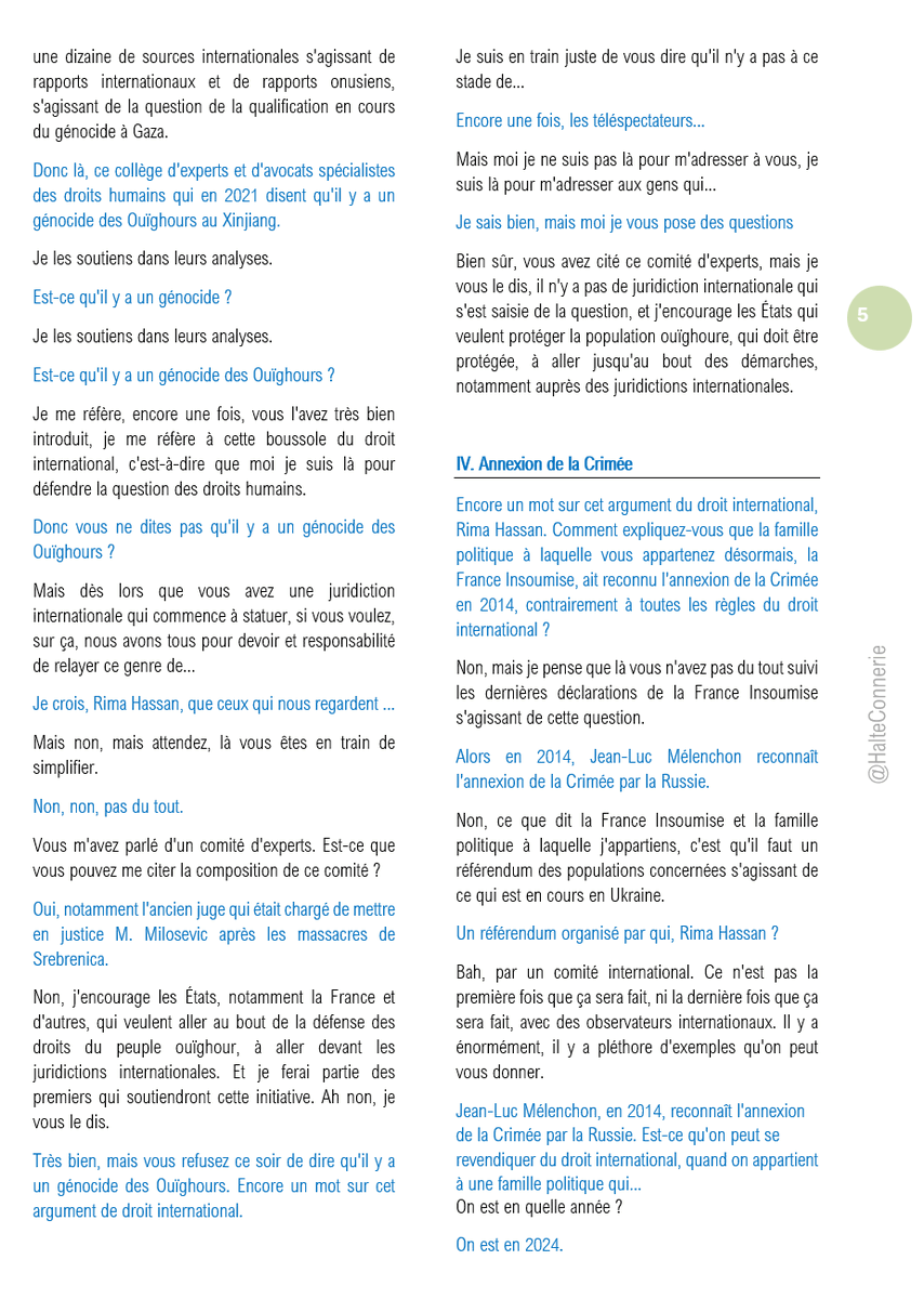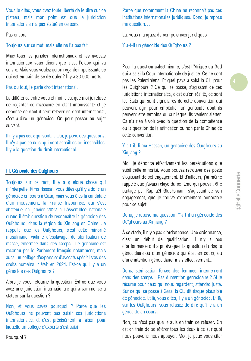 L'enchaînement de cette séquence avec la précédente est désastreux : parce qu'après avoir essayé de camoufler derrière une émotion surjouée l'inanité du raisonnement lui permettant de parler de génocide à Gaza, elle est incapable de cette même émotion pour évoquer les Ouïghours et reste dans la raideur froide du droit international...