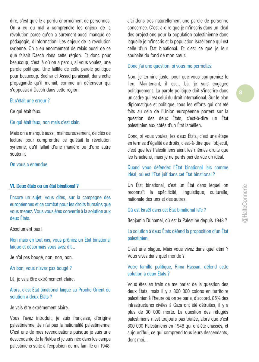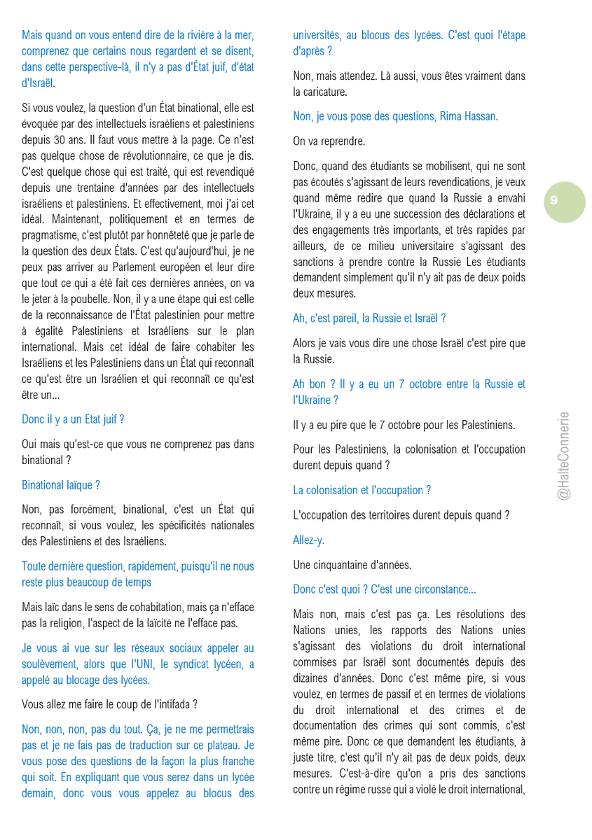 Pour le 6e et dernier point, retour à Gaza : alors Rima Hassan, vous êtes pour un état binational (sa position avant investiture) ou deux états (la position LFI et sa position post investiture) ?