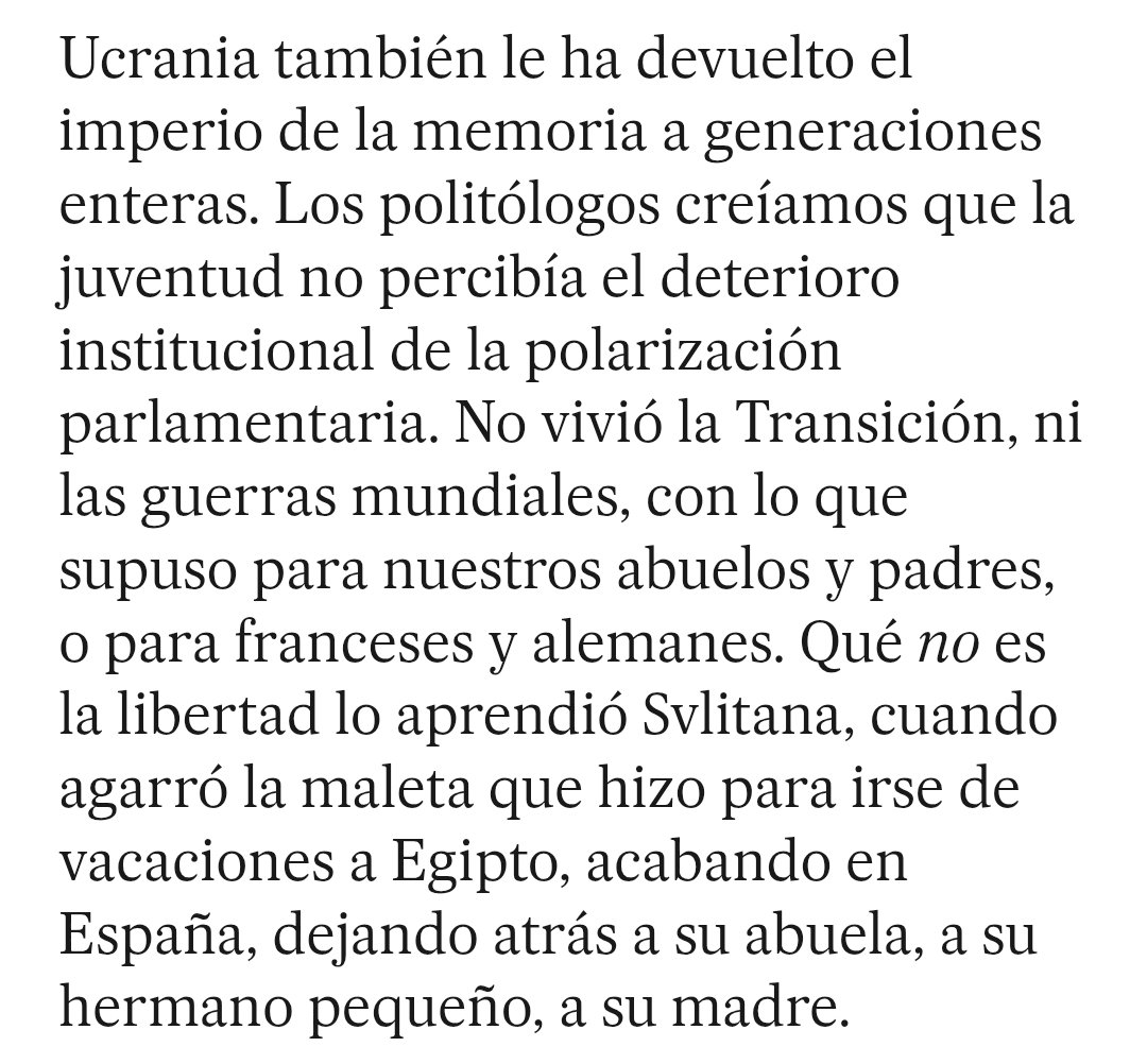 Para Estefanía, la guerra de Ucrania ha devuelto la esperanza a Occidente en la democracia y ha devuelto la memoria a generaciones que no vivieron la Transición o la II Guerra Mundial.