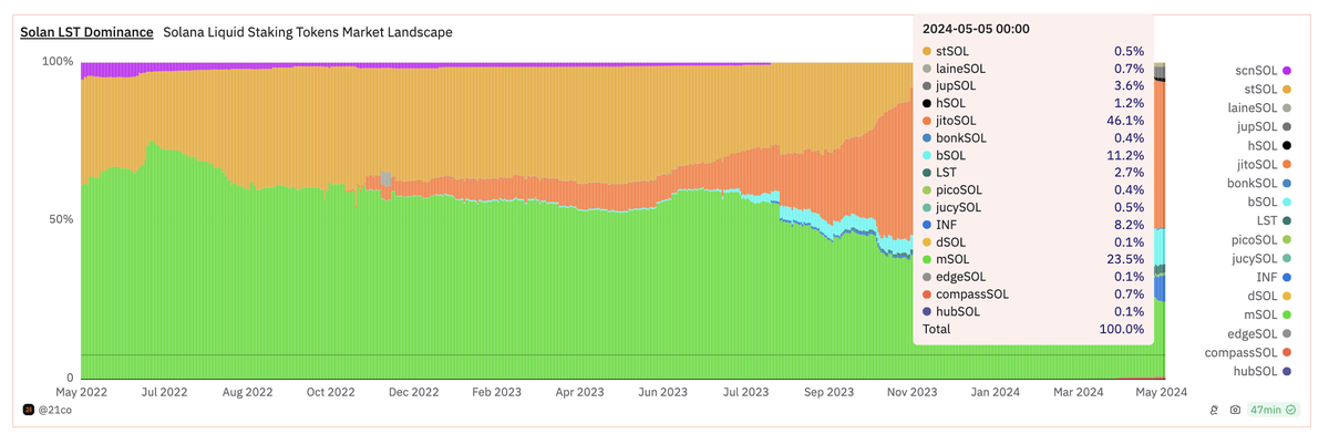 With the launch of jitoSOL in Nov 2022, they used about 1 Year to flip stSOL and mSOL and become the most dominant LST on Solana with 46% market share.