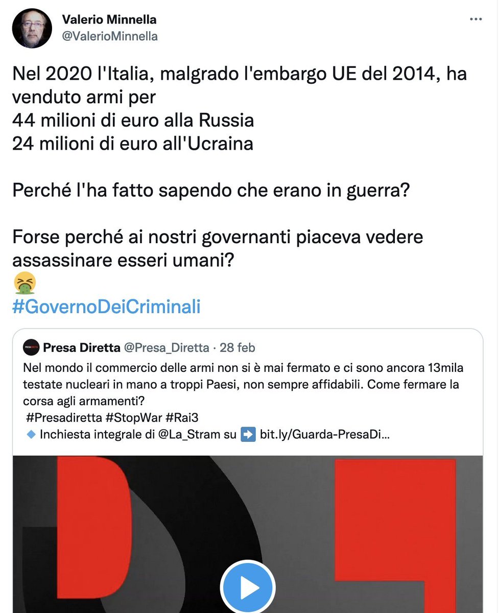 Mai questa gente ha speso una parola contro i governi criminali (italiani ed Europei) che dal 2014 (anno dell'embargo UE) al 24febbraio 2022 hanno riempito di armi Putin, appposta perché invadesse
