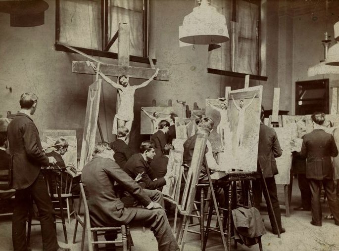 See, Academic painting took place in studios, with models, much like this: