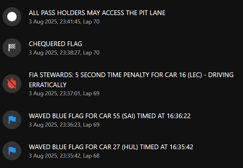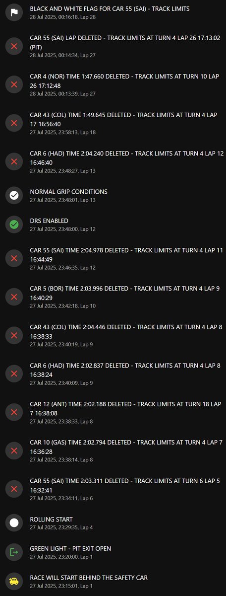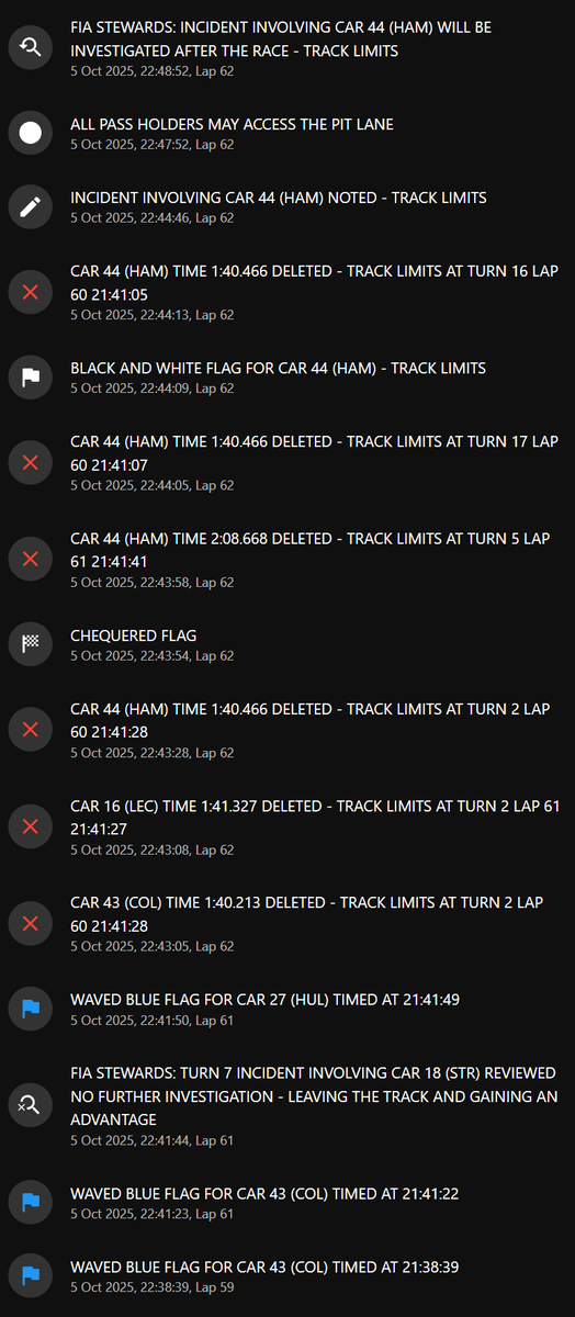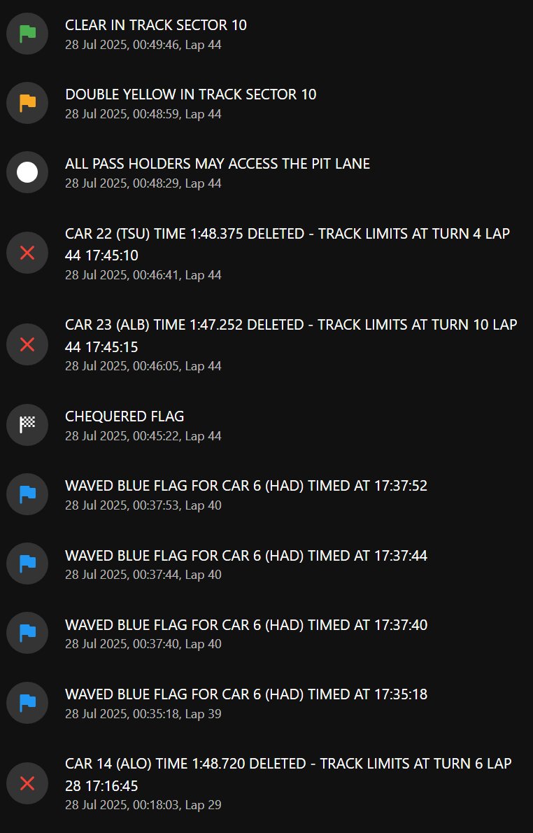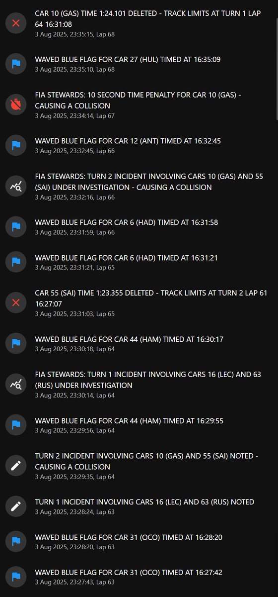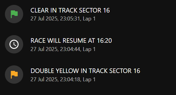 레이스컨트롤 메시지들. 그러니까 저 레드가 변수는 변수였는데 - 순위 측면에서 더 큰 변수 만든 건 마지막랩 옐로(그것도 더블)같기도 합니다. p1-p2하고 p6-p7 꽤 좁았던데다 전자는 영향 제대로받았을것(짐작이지만).
