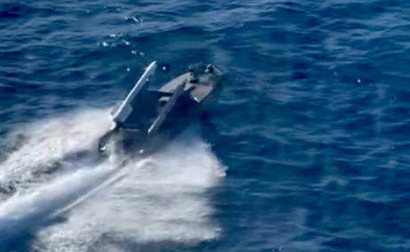 In the video, you can see a Russian helicopter shooting at the Ukrainian marine drone and eventually resorting it. The drone explodes suggesting that it also carried its regular suicide payload.
