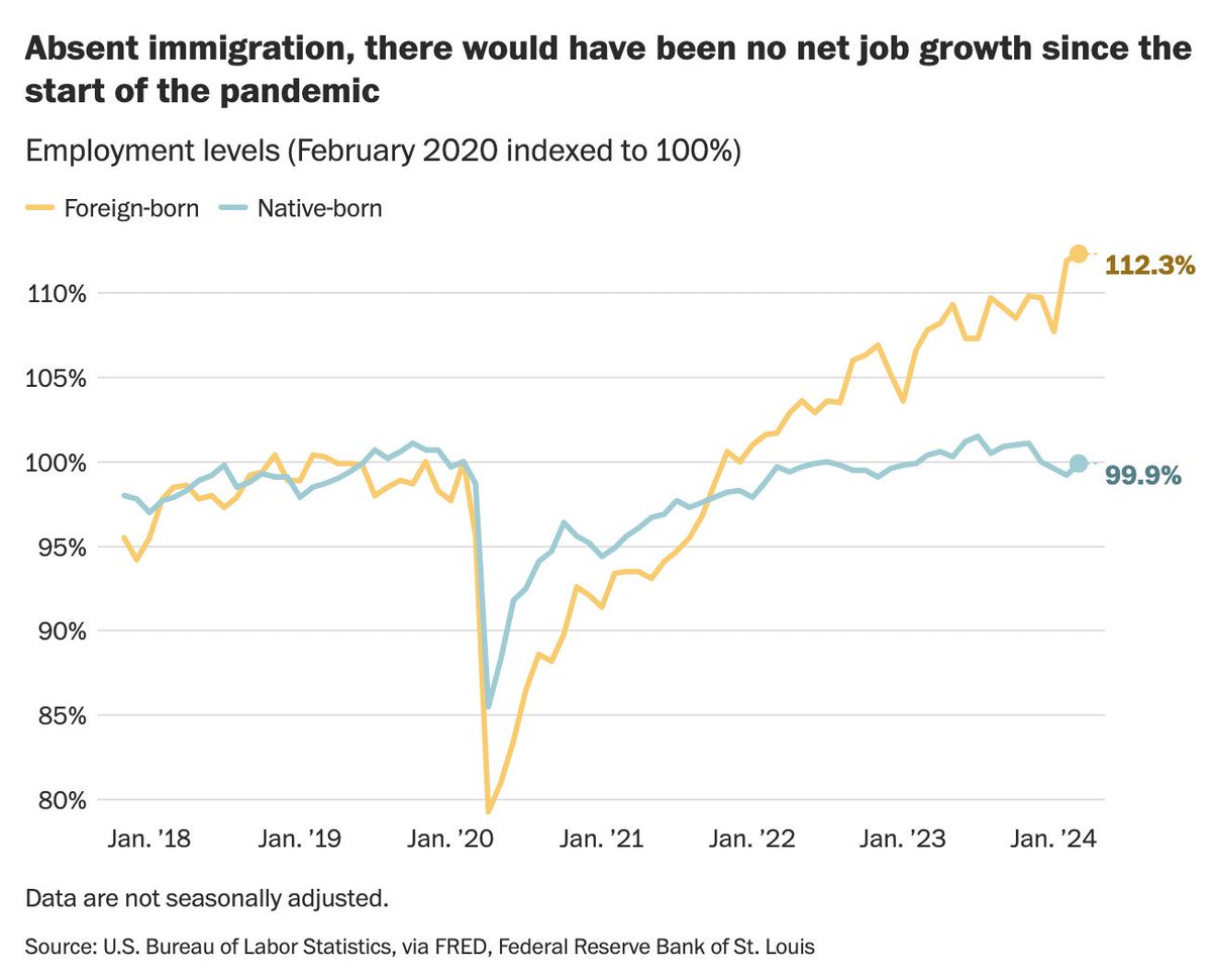 3. Since February 2020, there has been no net job growth among native-born Americans. The native-born workforce is flat or shrinking. Baby boomers are retiring, and birth rates are low. But there has been substantial job growth in the US since 2/20 because more immigrants are working.