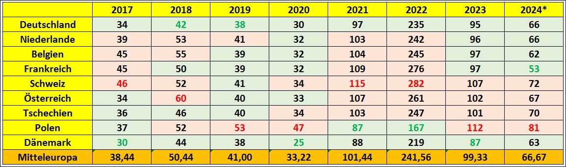 Nur 2 der 9 Länder liegen über alle betrachteten 8 Jahre im grünen (billigen) Bereich. Dies sind Deutschland & Dänemark..
