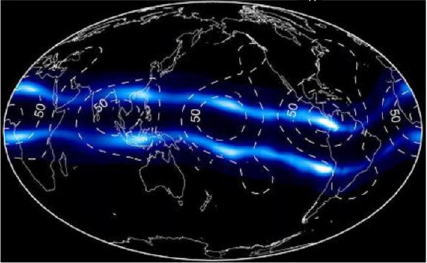 Double layers form when positive charges build up in one region of a plasma cloud and negative charges build up nearby. A powerful electric field appears between the two regions, which accelerates charged particles. Here we have plasma electromagnetic circuit flow as it happens on Earth during May. These are dual bands of ultraviolet light mark streams of plasma circling Earth’s equator -> Credit: NASA Image Satellite & University of California Berkeley.