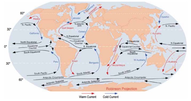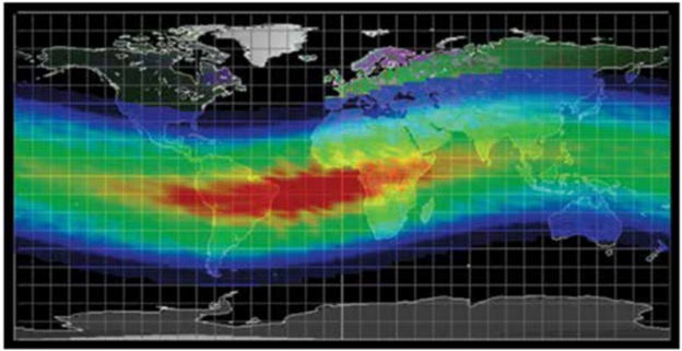 2. Contour plot of the trapped proton environment overlaying a map of the Earth. Proton density increases from blue to green to yellow to red. Contours are highlighting the SAA where the radiation particle population is high due to the offset nature of Earth’s magnetic field. Note the latitude effect.