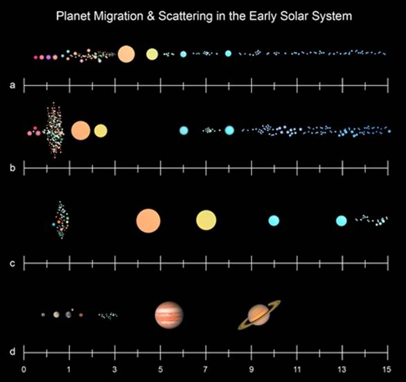 En 2005, des astronomes publient "Le modèle de Nice" qui montre que plusieurs énigmes du Système solaire peuvent être résolues si les 4 planètes gazeuses étaient proches les unes des autres avant de migrer, avec notamment Uranus et Neptune qui auraient échangé leurs places ! 2/8