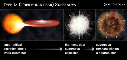 Une supernova 1a survient lorsqu'une étoile Naine Blanche (archi dense) vole de la matière à une étoile compagne.